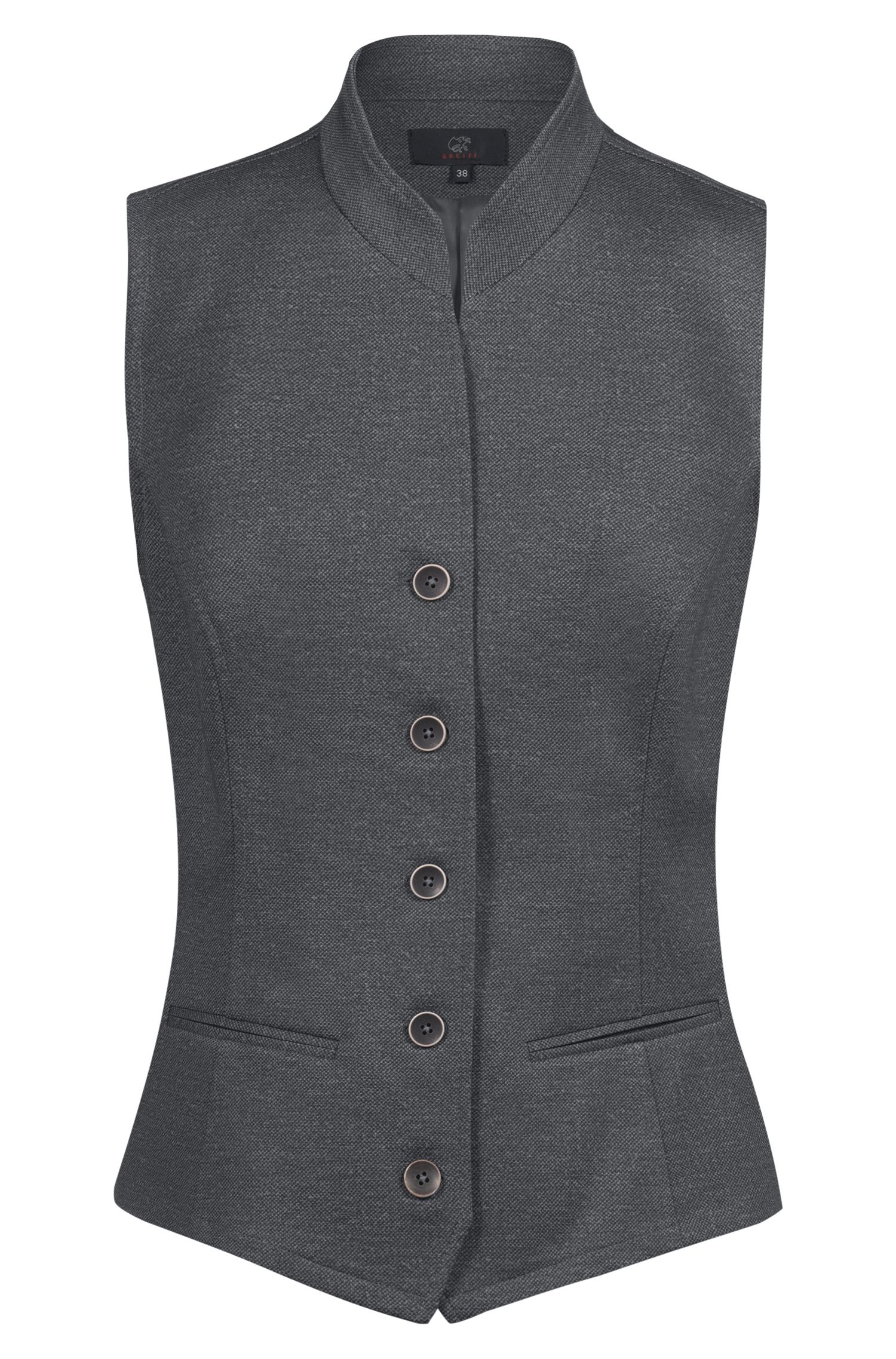 Damen-Jerseyweste RF Landhaus Regular Fit, Stehkragen, 4-Knopf, 2 Paspeltaschen, kurze Seitenschlitze, halbgefüttert, Rückenlänge 55 cm | Gr. 38. ·Gewebe: 67% Polyester 28% Viskose 5% Elasthan, 270 g/m² GRÖSSEN: 32 – 54