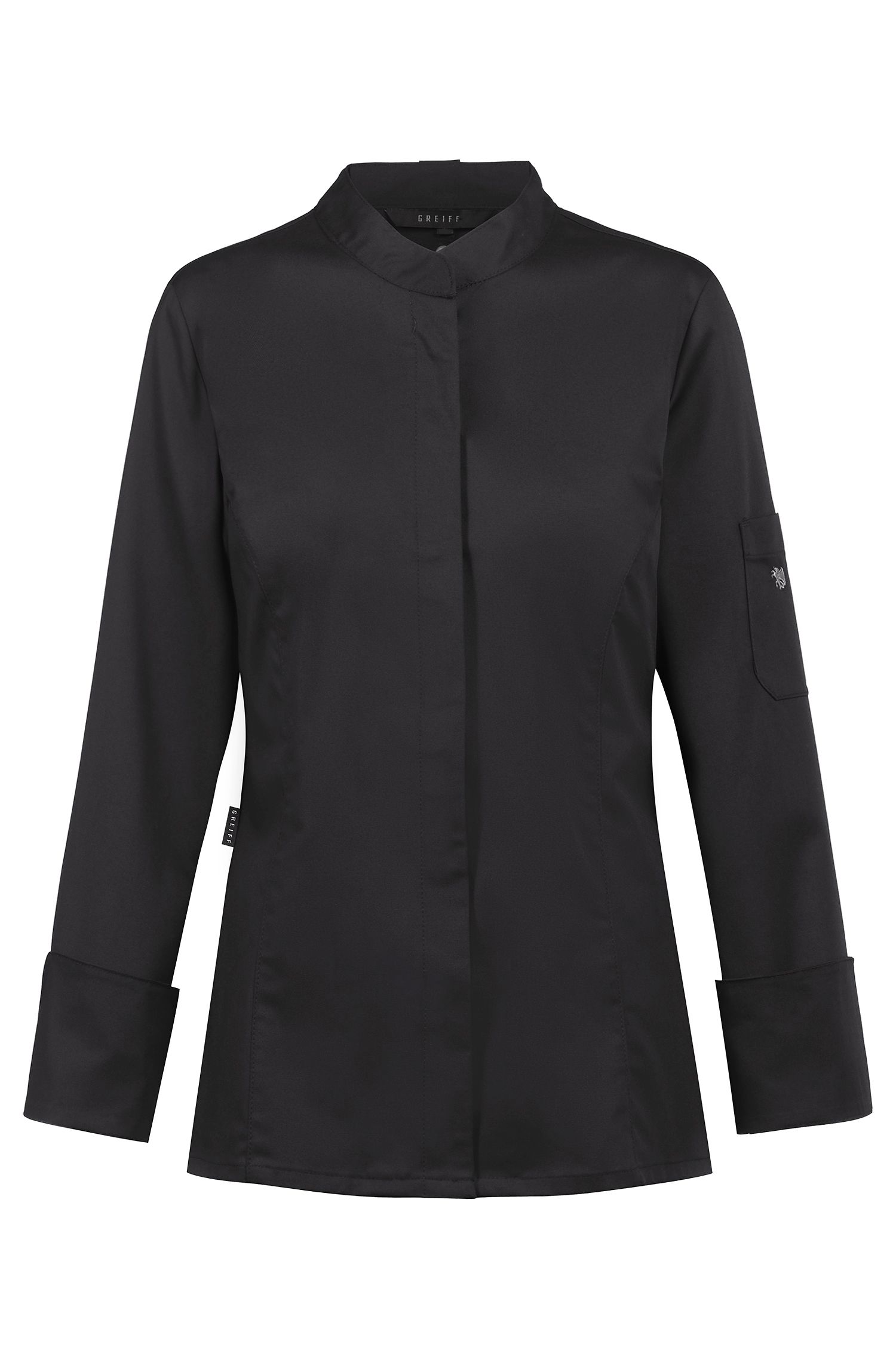 Damen Kochjacke RF Regular Fit, verdeckte Druckknöpfe, Armtasche mit Logo, Lüftungslöcher, Wiener Nähte im Vorder- und Rückteil, Schürzenschlaufe am Kragen. ·Gewebe: 49% Polyester 49% Baumwolle 2% Elastolefin, 200 g/m² GRÖSSEN: XS – 4XL